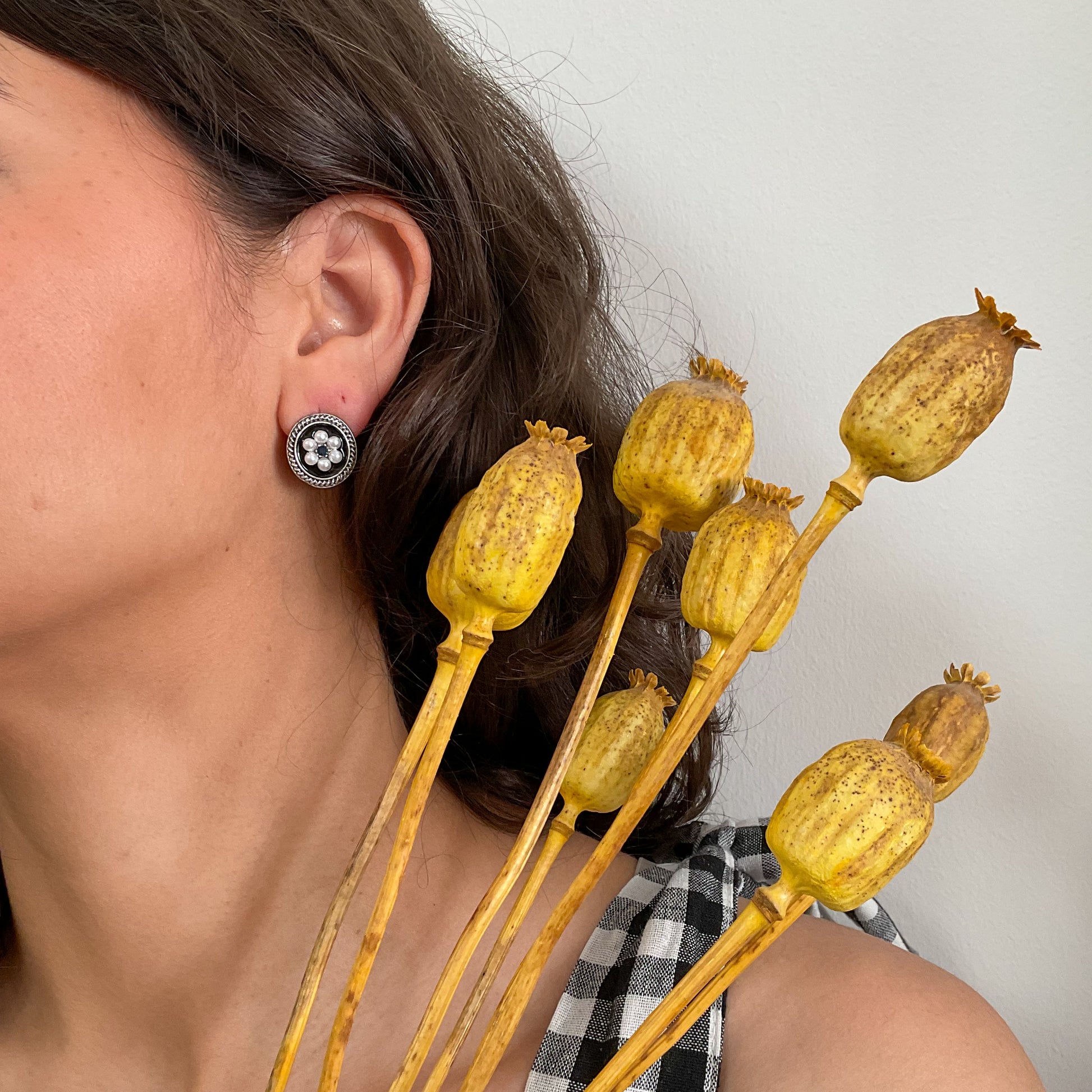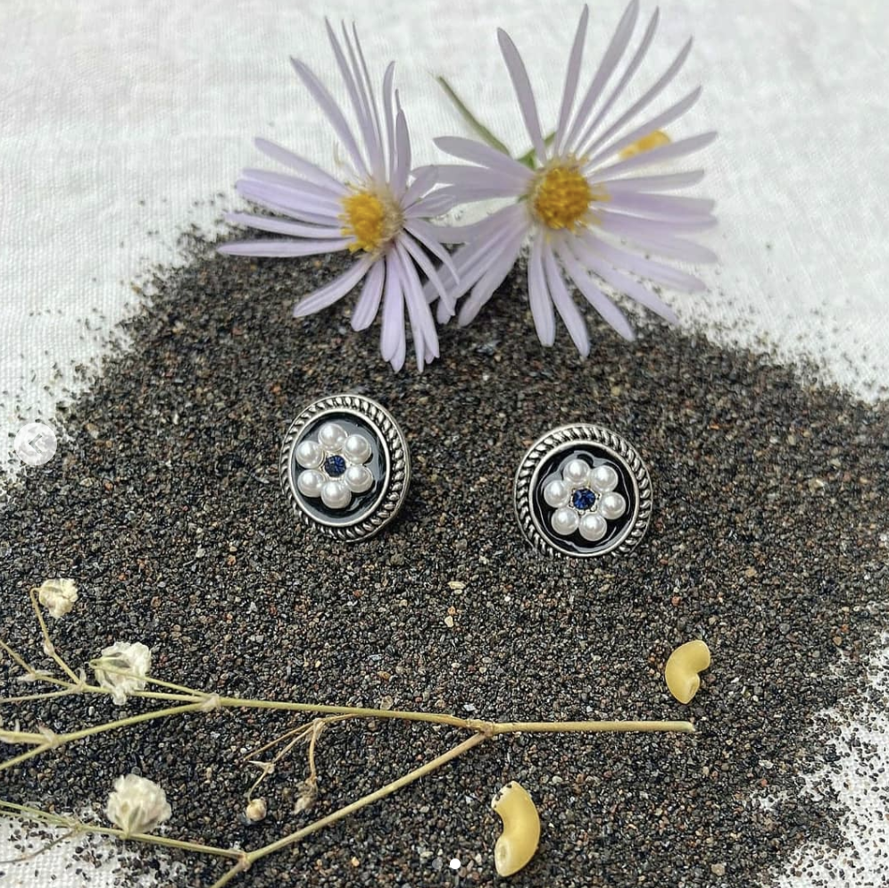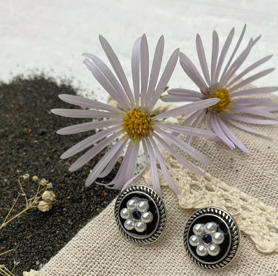 Boucles d'oreilles puces en acier inoxydable à motif fleurs bleu nuit et perles en résine. Style vintage pour un look élégant.